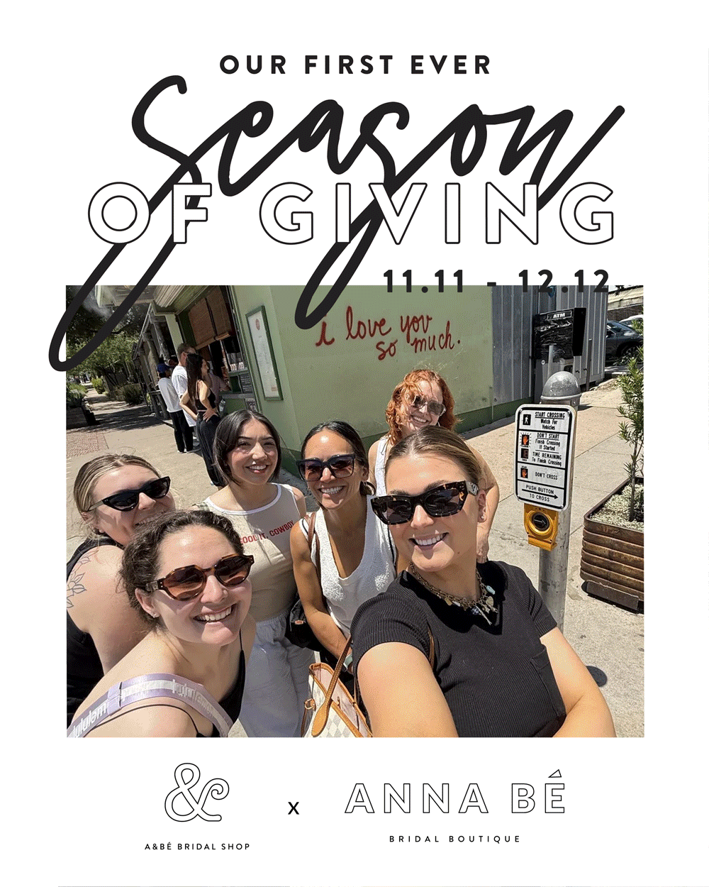 from our brides to our teams, we’re endlessly grateful for the love that surrounds our shops every day. this inaugural season of giving is our way of returning that love to the communities we call home everyday.