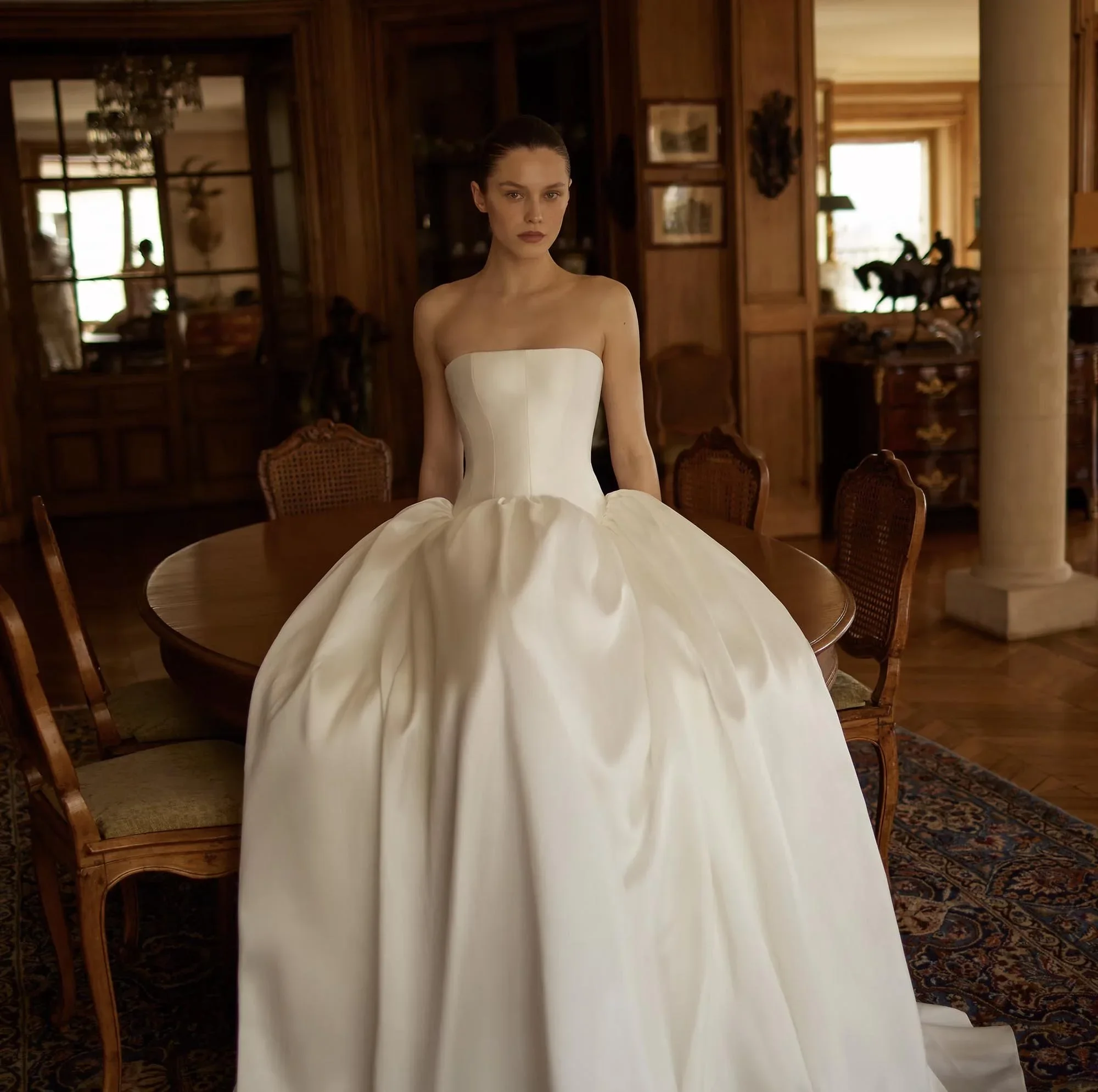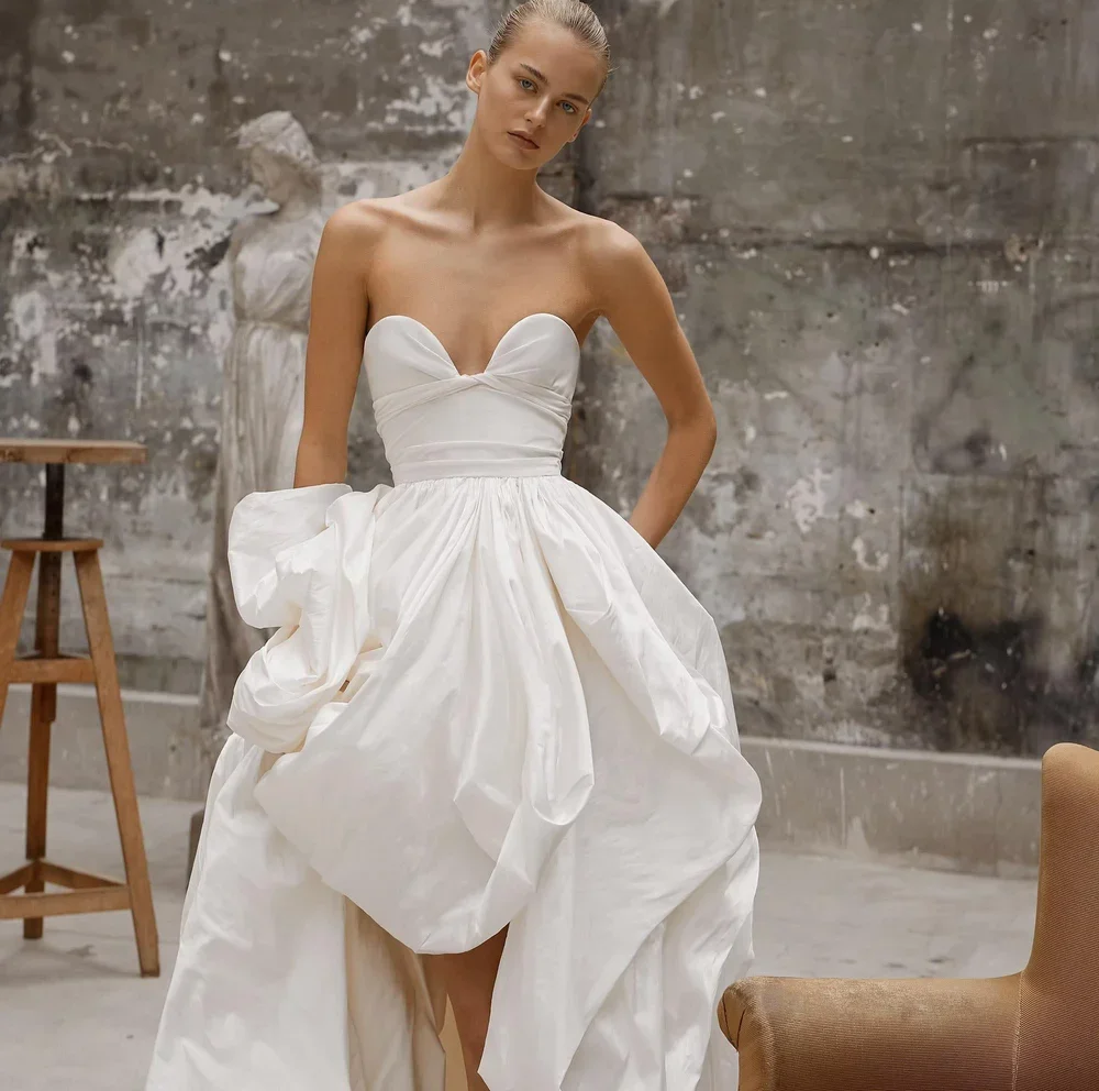her unique approach emphasizes geometric silhouettes achieved through thoughtful draping, ensuring each piece is distinctive while flattering every shape. these luxury wedding gowns are exceptional in both construction and design, brought to life by the combination of high-quality materials and intricate sewing techniques.