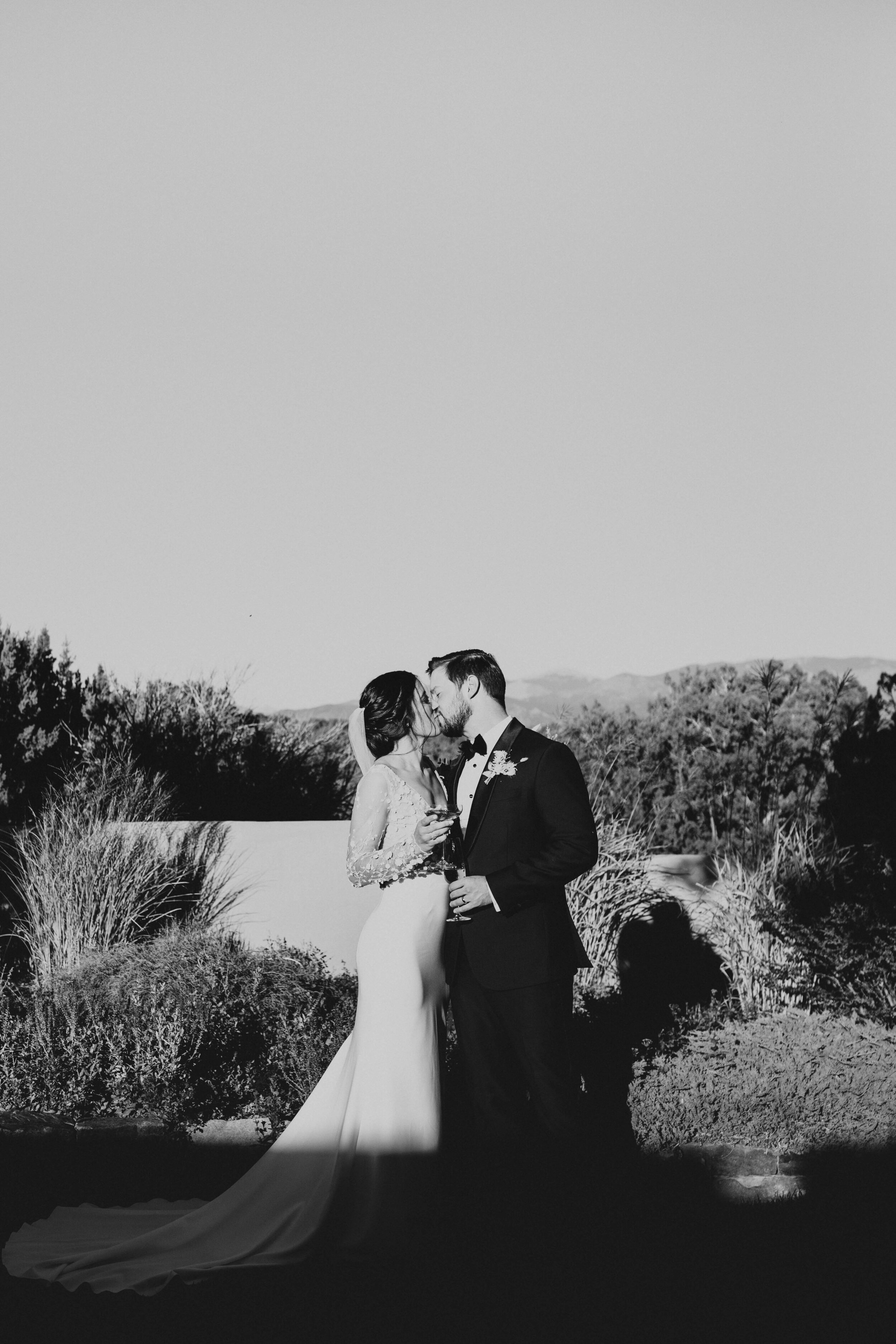 designer: anais anette / photographer: meredith soy photography / venue: private residence at las campanas / florals: emma lea floral / tux: the black tux / bowtie: brackish / wine glasses and champagne coupes: estelle colored glass / veil: yuri c. wedding shoppe / menus: curate events + design