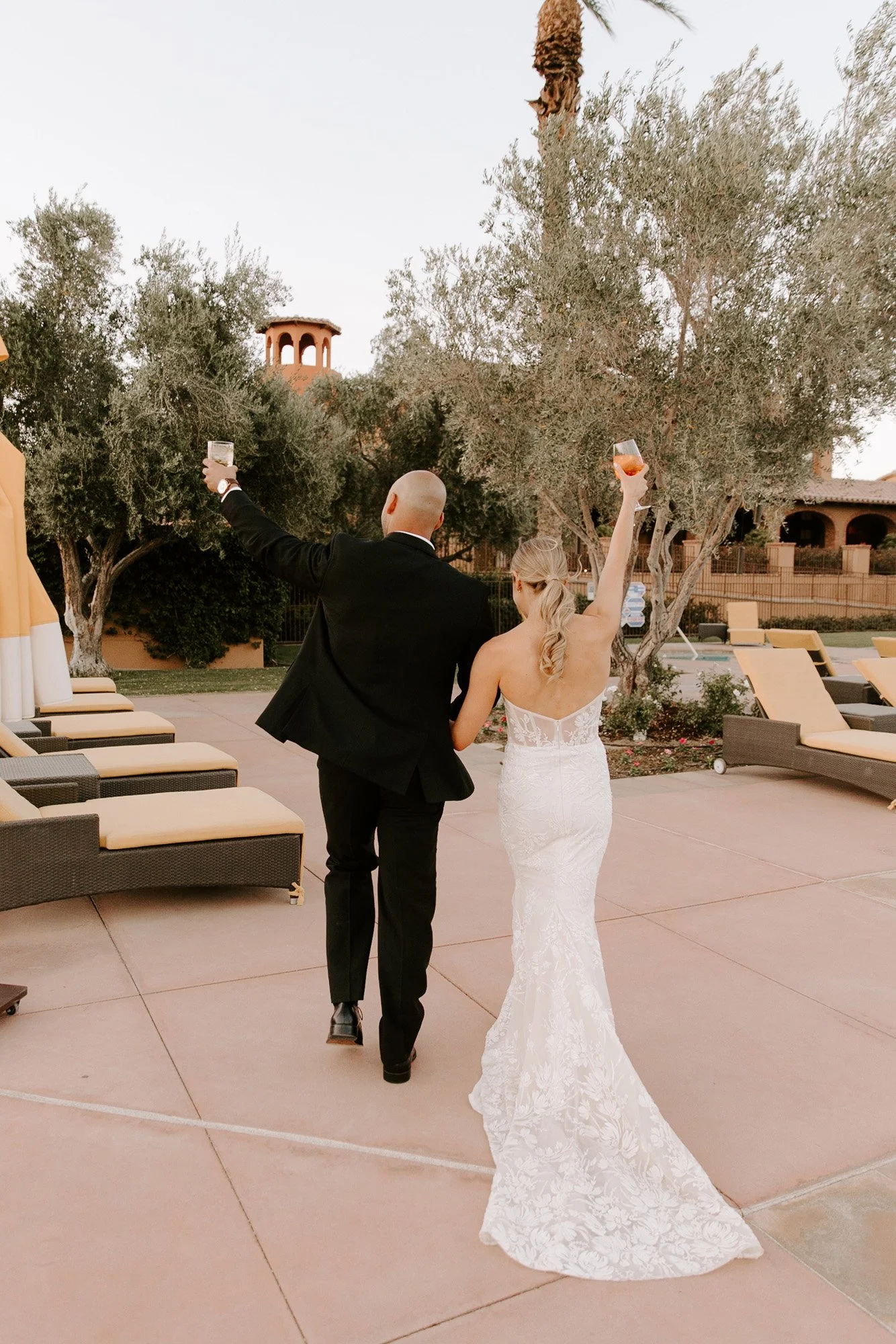 from posing for poolside wedding portraits at andalusia country club to hosting their reception among the shade of palm trees and terraces in the courtyard, this top palm springs wedding venue added to their modern wedding vibe.