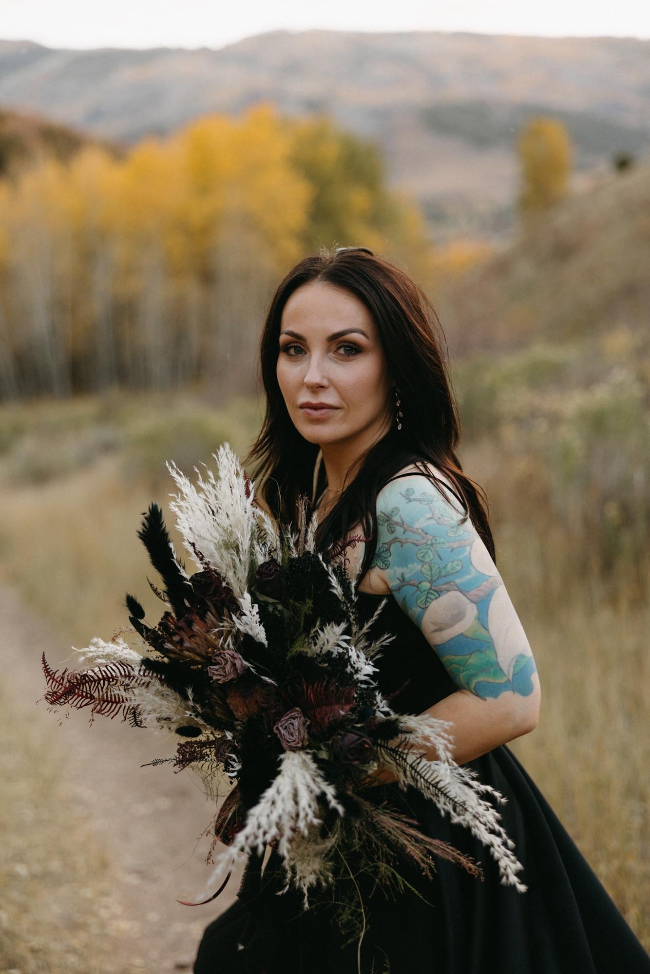 georgia found her colorful satin ballgown at a&bé bridal shop in denver, co. after discovering that this full satin wedding dress could be ordered in black, georgia said yes! pairing this black ballgown with a moody dried floral arrangement, georgia and kristen’s intimate ceremony included pops of color, crisp outdoor air, and of course, their precious dogs!