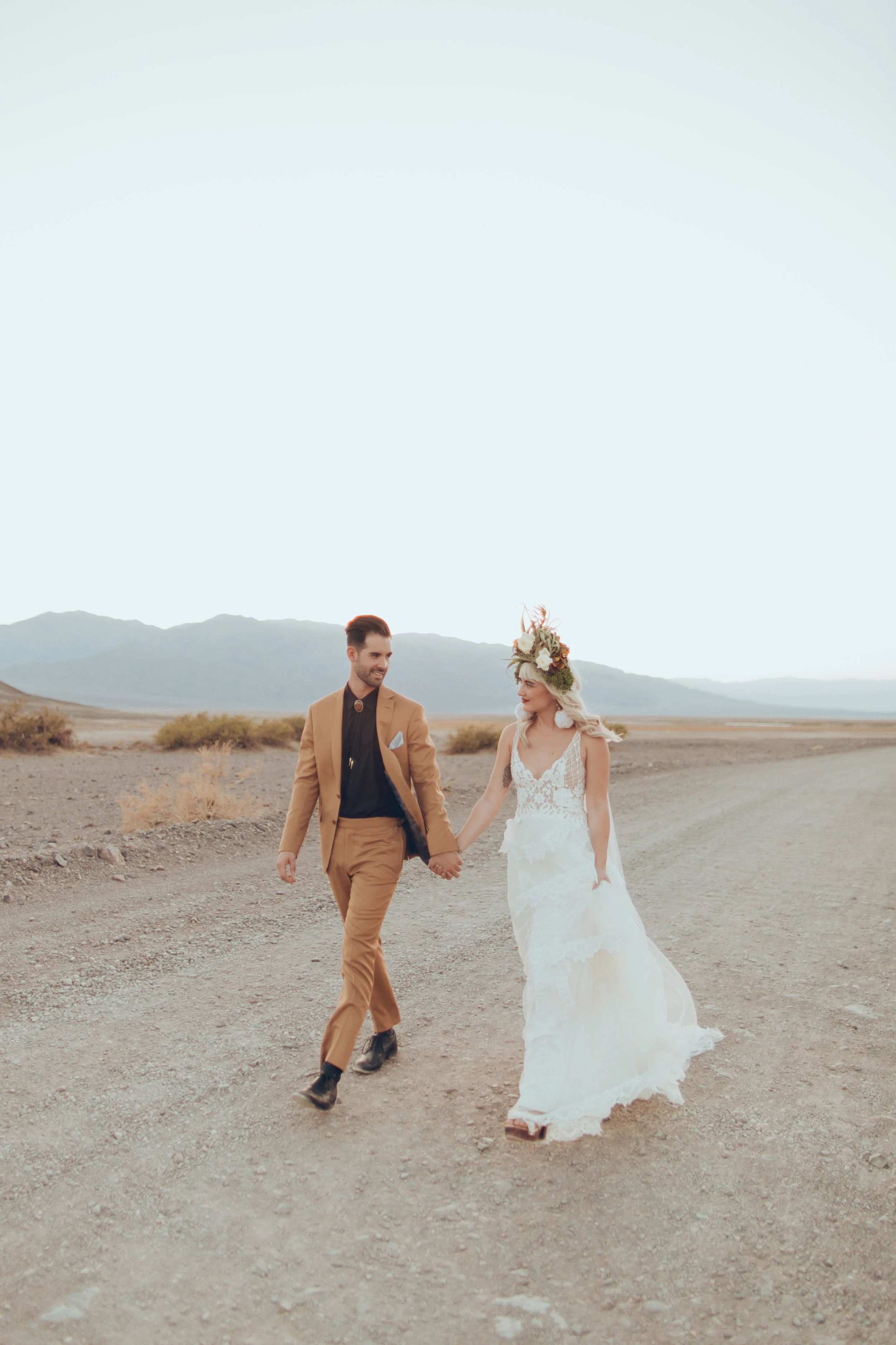 Featured Gowns: Made With Love, Rish Bridal Atelier, Rue De Seine // photography: Dillon Ivory // location: Death Valley, California // florals: tess.made // videography: Audrey Alba Films // styled by + model: Mad Maven Style // earrings: Ranjana Kahn, Mad Maven Style // crown: Amaroq Design | suit: Elevee
