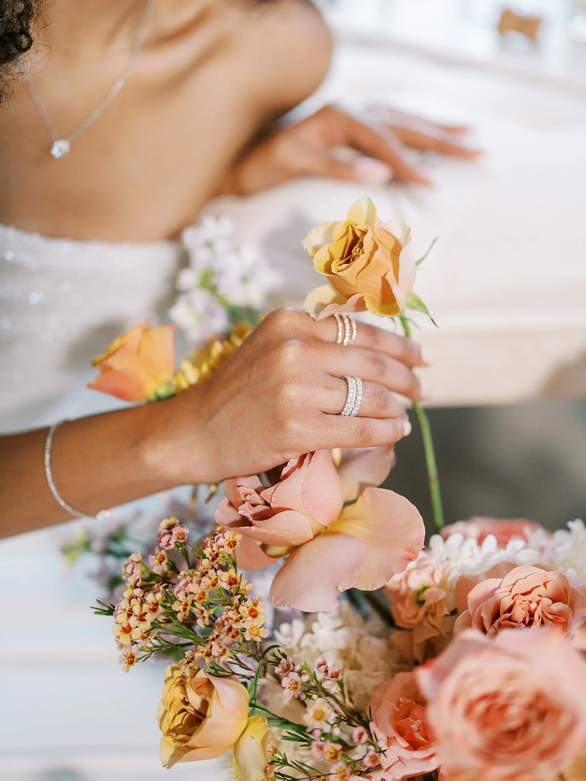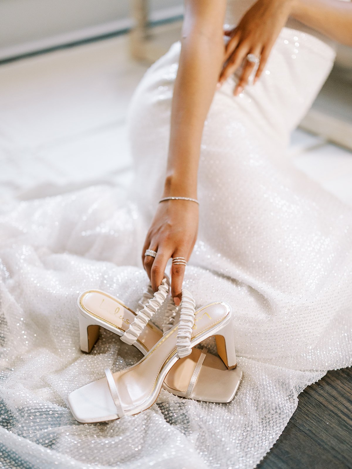 chic and classic without distracting from this delicately beaded alena leena bridal gown, we're obsessed with the care put into each accessory. from stacked diamond bridal rings to the scrunchy strap on the lulu’s bridal heels, every element completes the entire elevated wedding style.