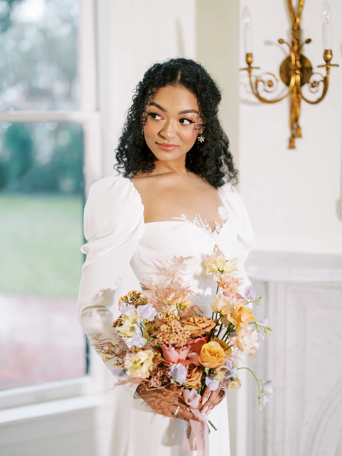 this open-back wedding dress glistens in the natural light of the woodbine mansion's vintage stained glass windows, but that’s not the only thing glowing in many of these shots. accenting this feminine bridal look are dainty bridal accessories like oversized floral studs and a diamond tennis bracelet.