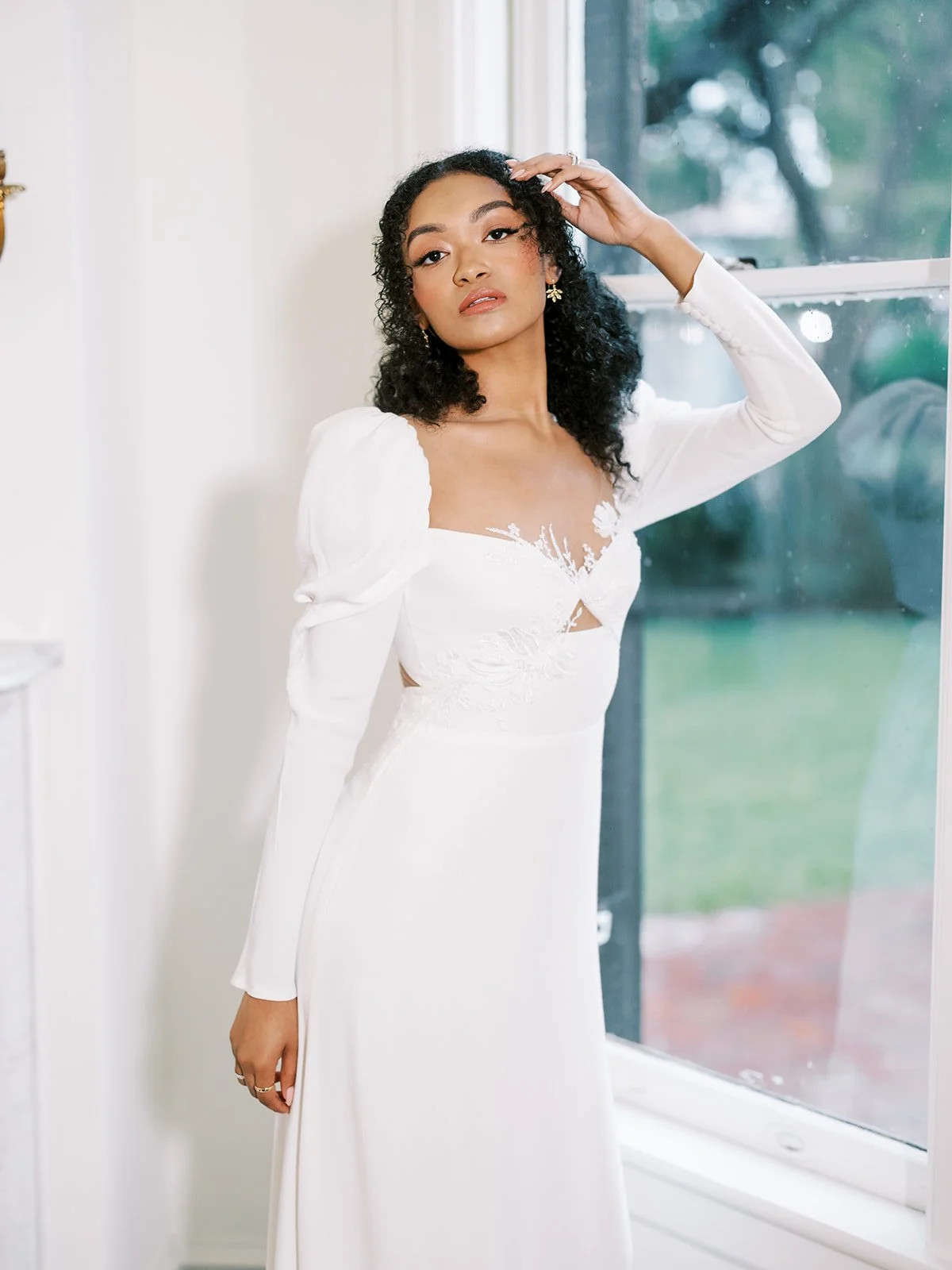 puff shoulder wedding dresses are trending and nobody does trendy mixed with traditional quite like alena leena. the classic fitted style of alena leena’s ‘clematis’ dress is contrasted by contemporary cutouts in both the front and the back.