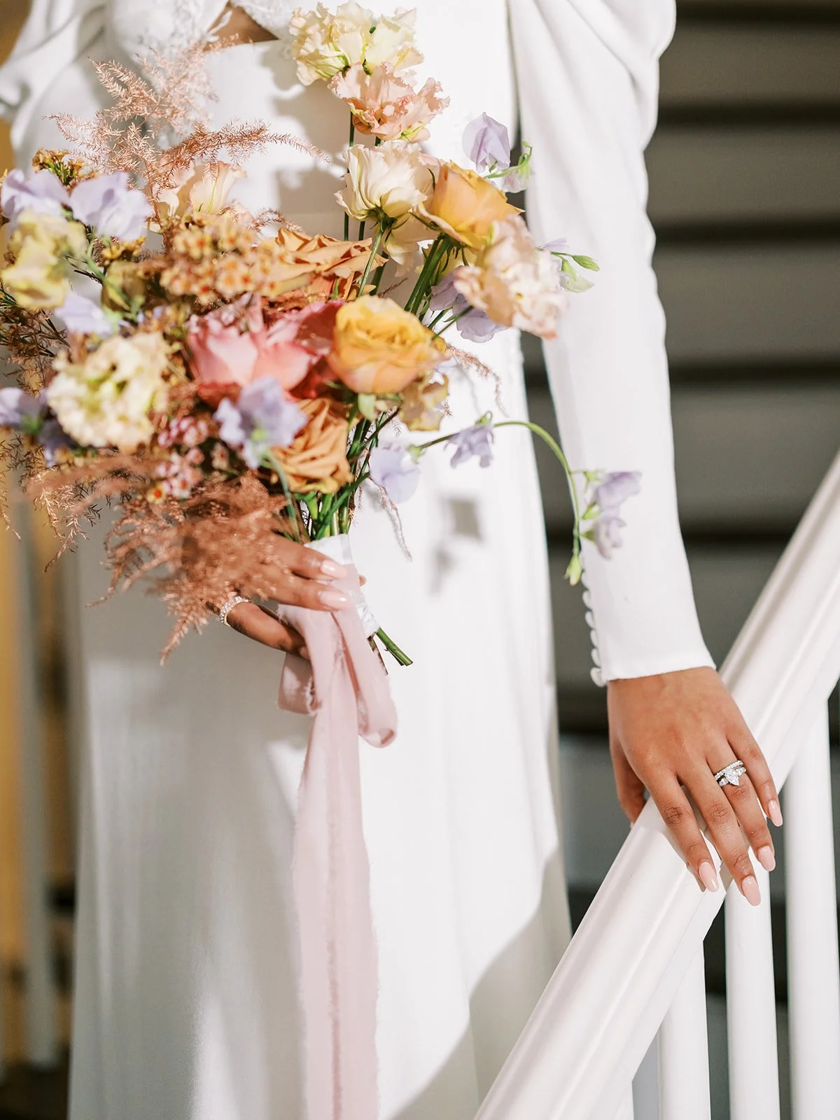 complimenting this spectacular wedding dress with sleeves, was the funky bridal bouquet designed by whim hospitality. with tons of texture and offbeat wedding colors, this original pastel wedding arrangement was quite a sight. we love how this bouquet accents the floral beadwork on the gown and really ties the entire wedding look together. even the floral-inspired earrings seem to match these colorful wedding flowers.